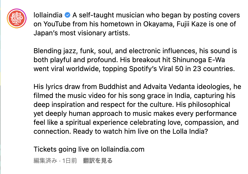 Lollapalooza Indiaの公式インスタグラムでの彼の紹介がとても面白かった。