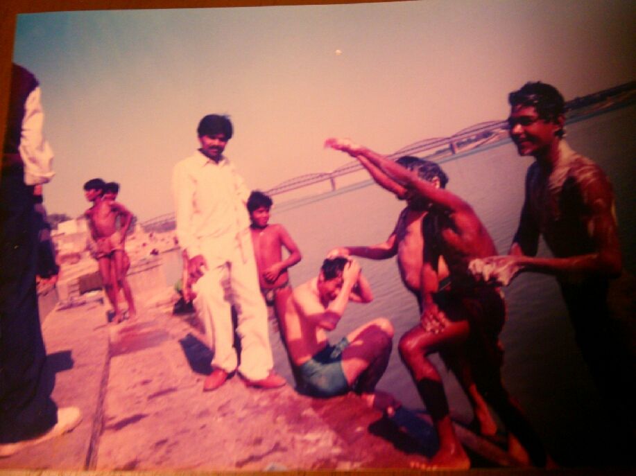 この写真はあのころのワタクシ、ガンジス河でインドの人たちに無理やり沐浴させられているところでさあ。